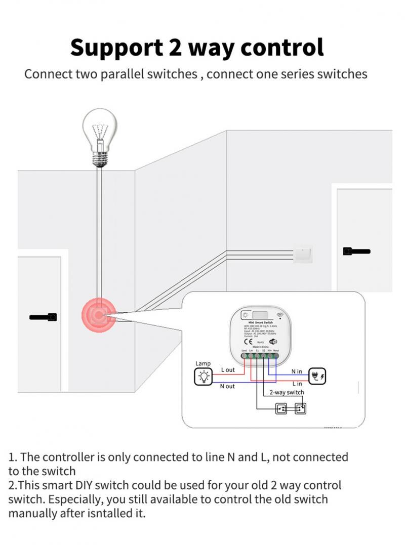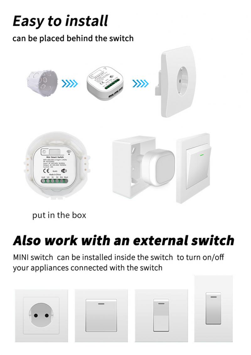 - Eenvoudige installatie – Compact ontwerp dat achter bestaande schakelaars past. Werkt met zowel N- als L-draden.